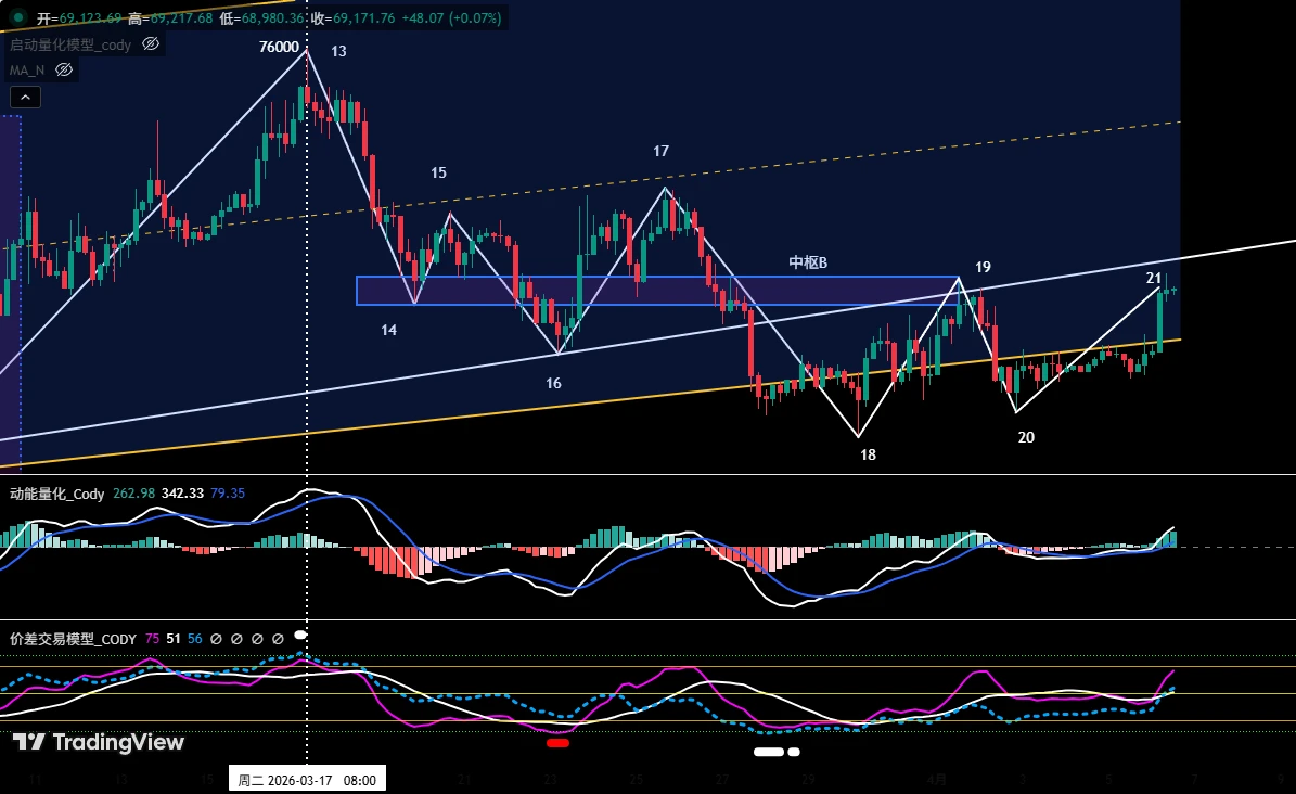 • 目前,价格正在运行第20-21段,币价已经触摸到中枢的上轨区域,大约在69,300美元附近。