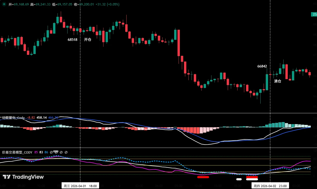 • 平仓:当币价下跌至65,000美元附近企稳时,价差交易模型触发了强烈的底部预警信号(红点+白点)。因此,我们于66,842美元附近将仓位全部清空。