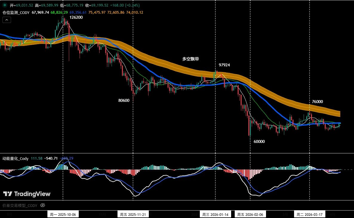 • 开仓:当币价反弹至69,500~72,000美元区域出现遇阻迹象,且模型同步触发顶部信号时,可建立15%的空头仓位。