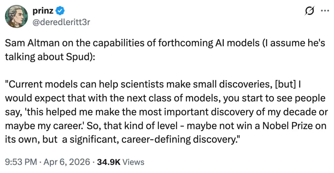 与此同时,Altman 还谈到了即将推出的下一代人工智能大模型,应该是传闻中的Spud。