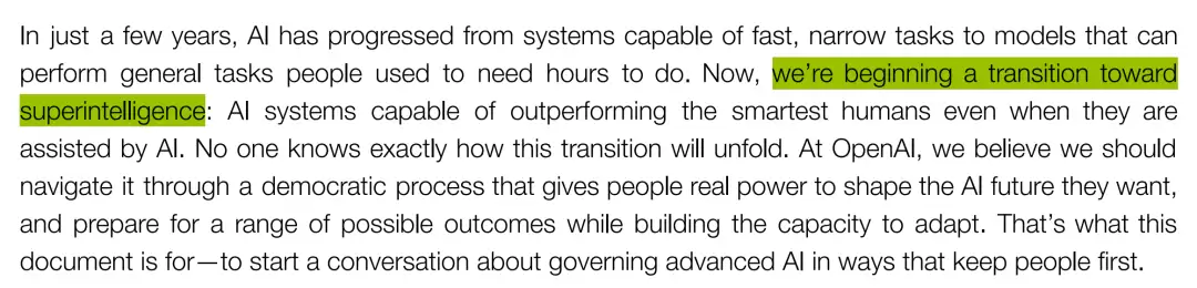 文中同样提到了,「现在,我们正在向超级智能过渡:AI 系统能够超越最聪明的人的表现,即使他们得到 AI 的帮助。没有人确切知道这一过渡将如何展开。在 OpenAI,我们相信应该通过民主的过程来引导这一过渡,让人们真正有权力塑造他们想要的 AI 未来,并为各种可能的结果做好准备,同时建立适应能力。这正是这份文档的目的:开始一场关于如何以人本为中心治理先进 AI 的对话。」
