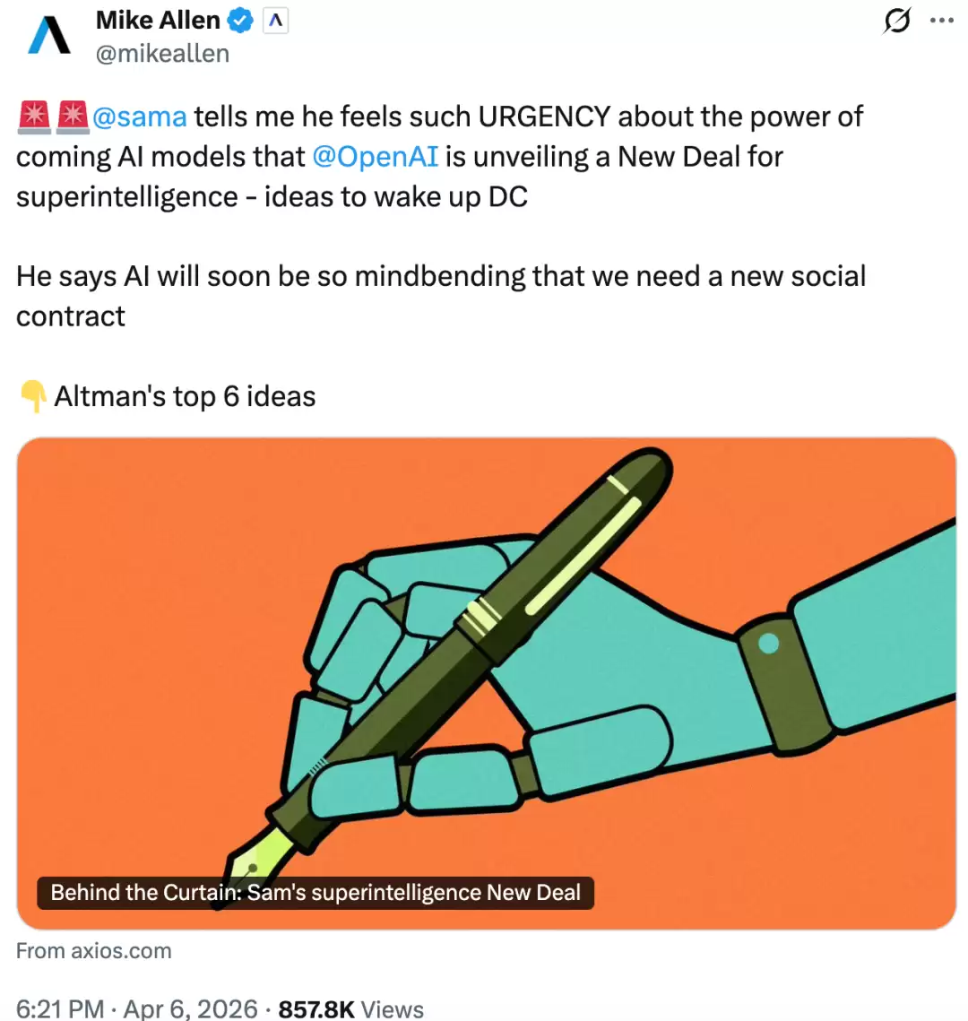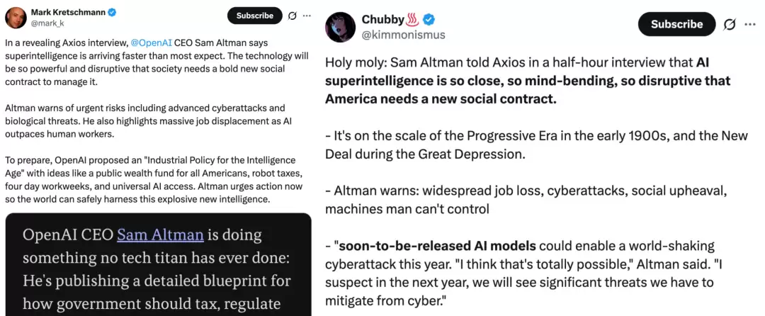 昨晚,在一场引人注目的Axios采访中,OpenAI CEO Sam Altman 表示,「超级人工智能的到来比大多数人预期的要快。这项技术将变得如此强大和具有颠覆性,以至于社会需要制定一个大胆的新社会契约来加以管理。」