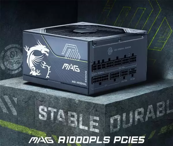 MAG A1000PLS PCIE5战斧导弹额定功率1000W,原生12V-2×6接口,面向RTX 5090等单卡旗舰平台用户,基于ATX 3.1/PCIe 5.1规范,通过80PLUS、Cybenetics、PPLP三重白金认证。