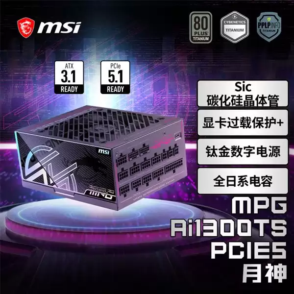 定位最高的MPG Ai1300TS PCIE5月神额定1300W,获得三重钛金认证,最高转换效率达94%。