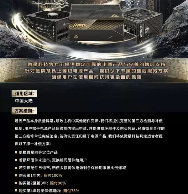 微星同时表示,金牌及以上认证电源均提供因电源故障导致其他设备损坏的索赔服务。
