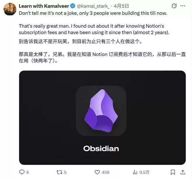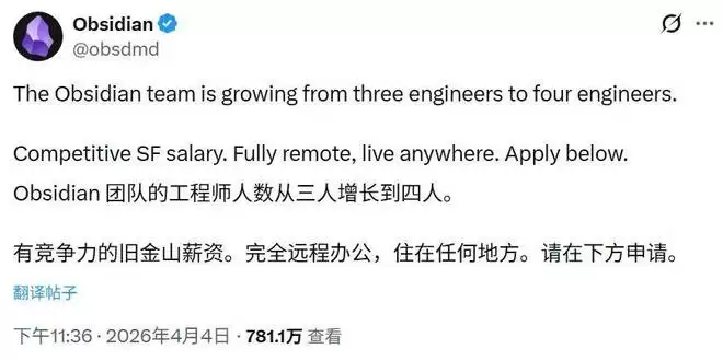 最近,Obsidian 最新的一条招聘推文引发了全网近千万的浏览与讨论。