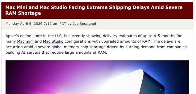 【环球网科技综合报道】4月7日消息,据Macrumors报道,美国苹果在线商店显示,多款配备升级版内存的Mac mini和Mac Studio机型面临严重发货延迟问题,预计需4至5个月才能送达消费者手中。这一状况主要源于全球内存芯片供应紧张,而背后则是人工智能服务器制造商对内存需求的急剧攀升。