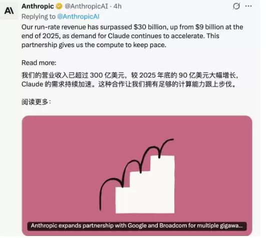 北京时间4月7日,美国大模型头部公司Anthropic对外公布,公司年化收入(ARR)超过300亿美元,较2025年底的90亿美元大幅增长,Claude需求持续加速,已超过行业披露的OpenAI年化收入250亿美元。而仅仅十六个月前,Anthropic 的收入还只有10亿美元。