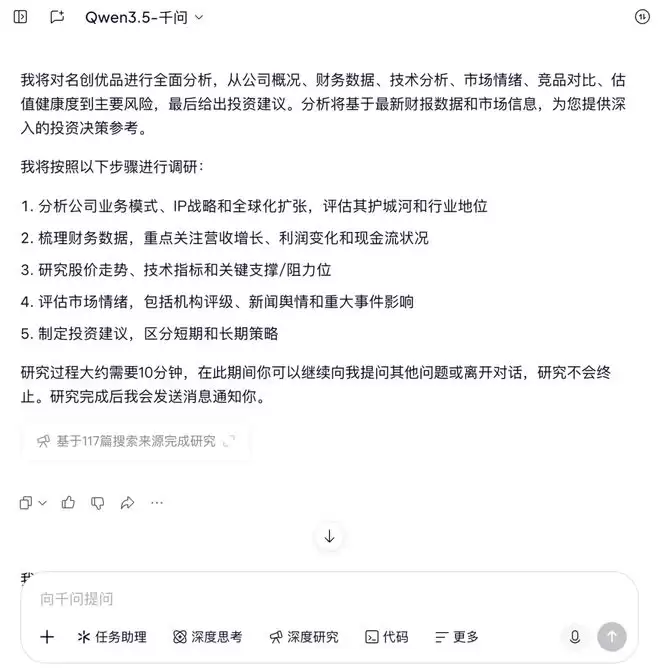 通过与同花顺合作,千问接入了超过 1.3 万只股票的分钟级实时行情数据,并整合了约 100 万份上市公司财报、公告及权威机构研报。基于全网数据调研,千问能直接帮用户输出一份完整的深度研究报告。