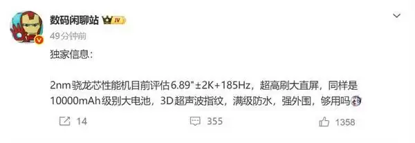 在屏幕配置上,新机预计采用6.89英寸2K超高刷直屏,并支持惊人的185Hz刷新率。此外,它还将配备先进的3D超声波屏幕指纹技术,并提供最高等级的防水保护。