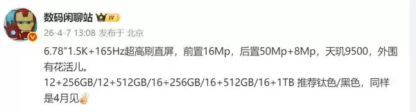 【CNMO科技消息】4月7日,CNMO注意到,博主“数码闲聊站”疑似曝光了一加Ace 6至尊版的核心配置。