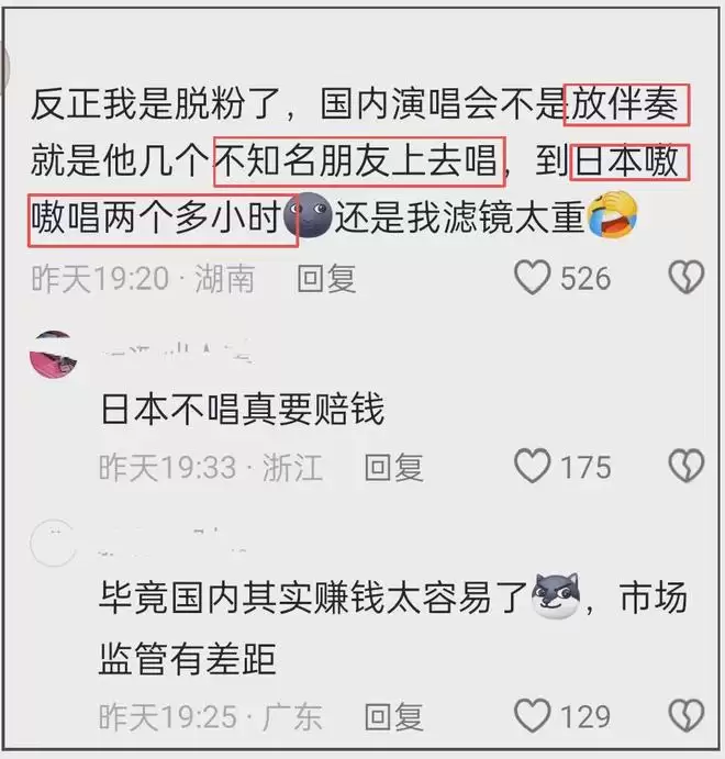 在大量吐槽声中,有粉丝还称周杰伦国内国外两副面孔,在国内不是放伴奏带就是请朋友凑演唱时间,而到了日本则情绪高昂演唱两个多小时,态度完全不一样。当然,有网友指出区别来自两地的监管力度不一样,若在日本不唱满会罚款。