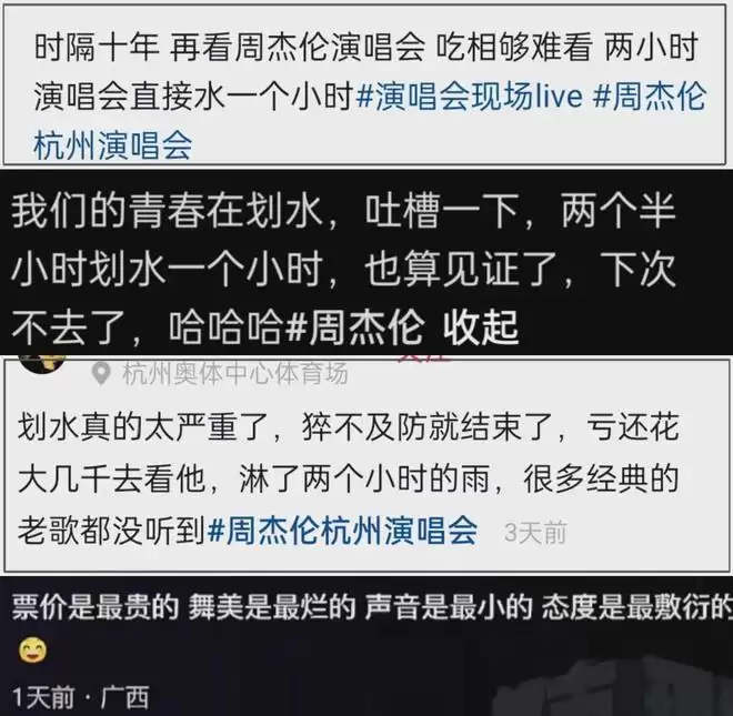 搜索周杰伦划水相关,粉丝的吐槽声音很集中,首先不满的就是演唱会演唱不足,两个小时的时间有一个小时划水;其次舞美音响设备烂,话筒声音小,观众听不太清演唱。而且,周杰伦演唱会溢价严重,黄牛票还没有彻底消失,很多花高价买票淋雨的粉丝都只能认了为情怀买单,但是再没有下次了。
