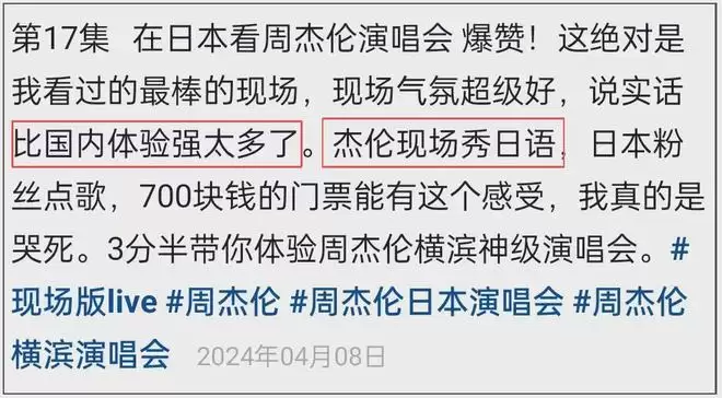 对比中日两地粉丝的演唱会反馈,能明显看到周杰伦对日本演唱会更上心,粉丝们也直言比国内体验感强太多,称周杰伦不仅现场秀日语。还能唱高音。