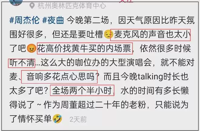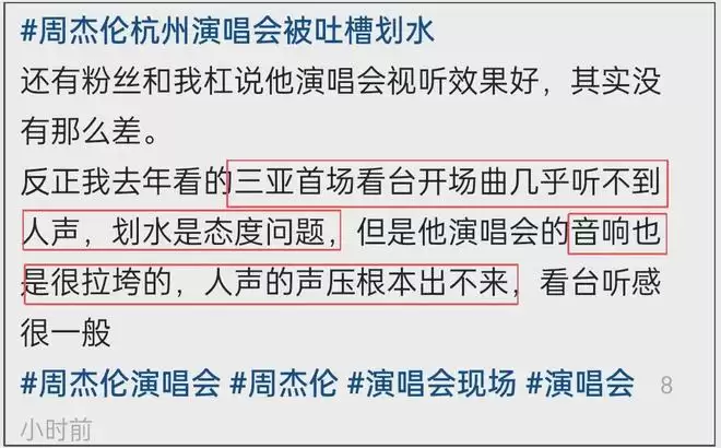 许是吐槽周杰伦话筒声音演唱小的问题太多了,不少粉丝也从情怀中清醒了过来,表示划水是态度问题。