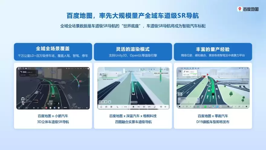 目前,这项领先技术已成功落地。它已在小鹏汽车合作共创的3D立体车道级导航、深蓝汽车与梧桐车联合作的四图融合导航中实现量产上车。此外,零跑汽车即将发布的旗舰车型D19也将搭载。预计到2025年内,搭载百度地图车道级SR导航的智能汽车车型将超过10款。
