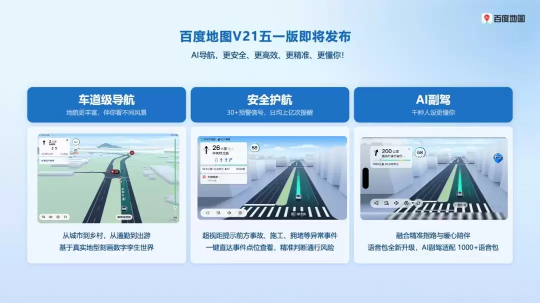 面向更广泛的C端用户,百度地图预告了即将发布的手机端V21五一版。新版本将进一步丰富车道级地貌渲染细节,全新升级超过30项超视距安全预警功能。同时,“AI副驾”的人设与技能库将得到大幅扩充,实现上千种个性化语音包与精准指路、暖心伴聊等功能的深度融合。