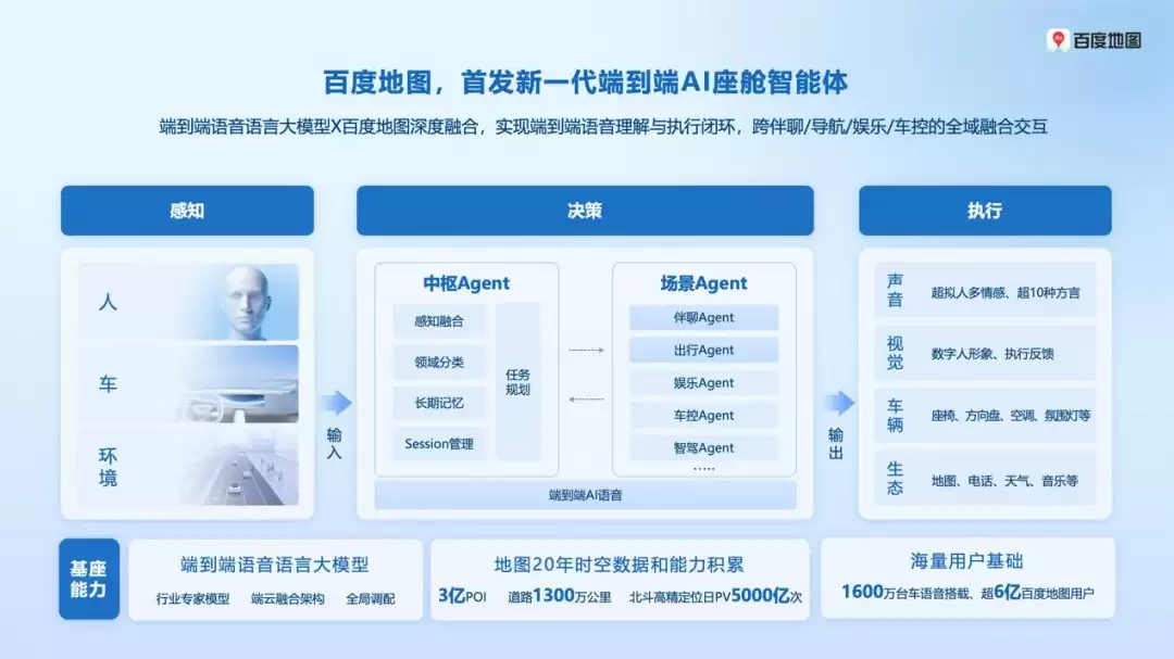 基于这一战略判断,百度地图发布了行业首个实现量产的端到端AI座舱智能体。该产品以百度语音语言大模型为技术基座,深度融合了百度地图20年积累的超大规模时空数据与AI能力,并整合了百度搜索精准高效的信息检索技术。其核心创新在于一个“中枢智能体”,由它统一调度导航、娱乐、车控及伴聊等多个子智能体,从而实现了从口语化指令理解到复杂任务执行的全链路闭环。