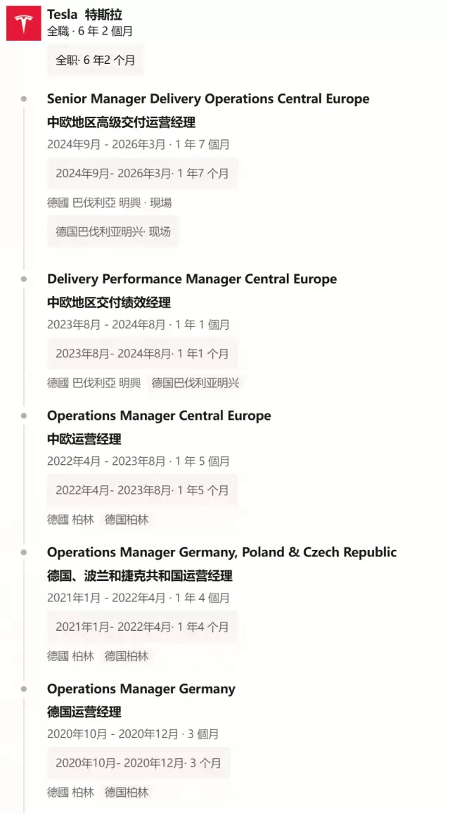 审视迪特·洛伦茨的职业履历,不难理解此次任命的重要意义。他在特斯拉的六年职业生涯中,先后担任过中欧运营经理、德国运营经理、运营主管等多个核心管理岗位。他深度参与了特斯拉在欧洲,特别是德语区市场从初期开拓到体系成熟的全过程,在交付网络与运营体系的构建方面积累了宝贵的实战经验。