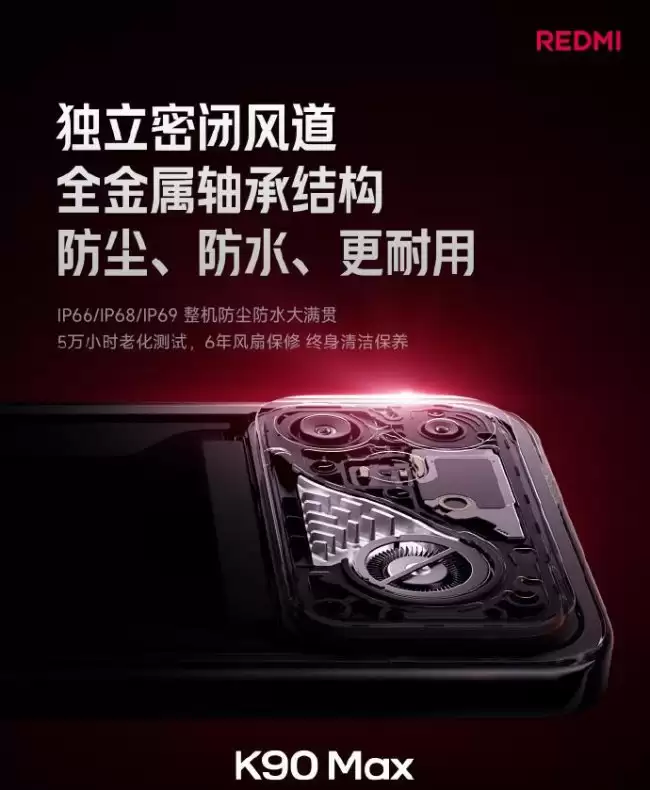 REDMI K90 Max 所采用的风冷散热系统,在设计与用料上颇具看点。它采用了独立密闭风道与全金属轴承结构,不仅提升了散热效率,更增强了系统的耐用性和稳定性。令人印象深刻的是,整机在如此设计下,依然支持IP66/IP68/IP69级别的全方位防尘防水,并顺利通过了长达5万小时的严苛老化测试。官方为此承诺提供“6年风扇保修与终身清洁保养”服务,充分彰显了对产品工艺与品质的自信。