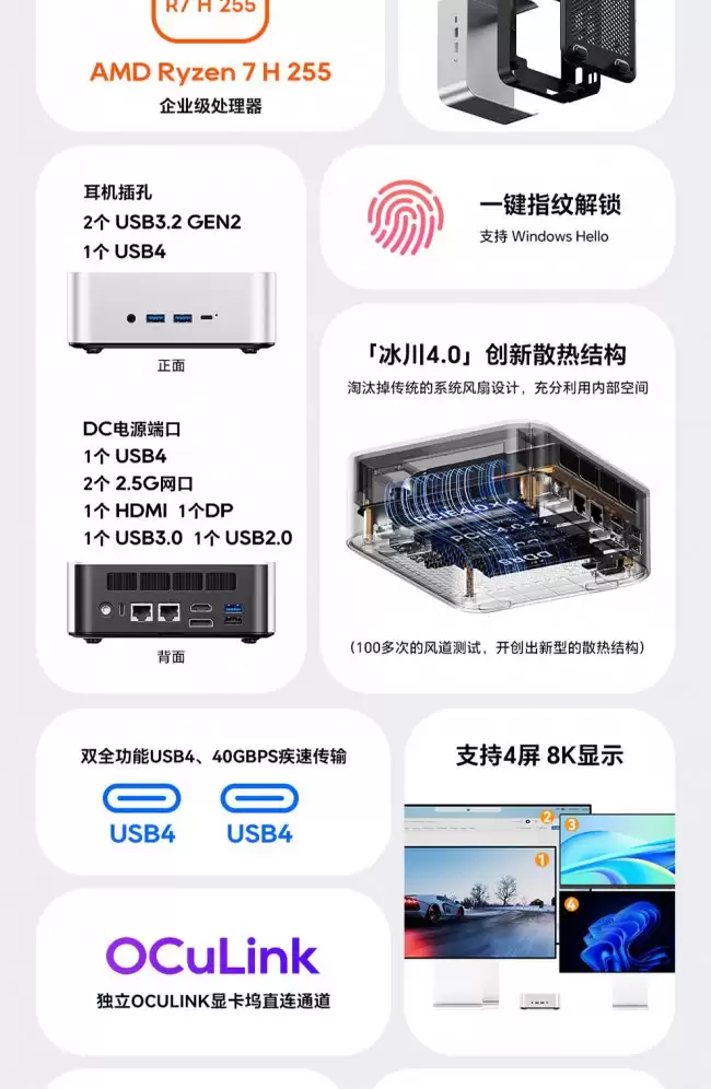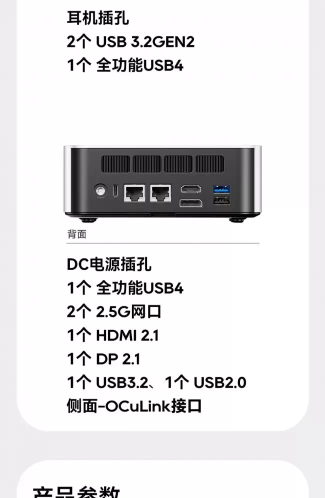 接口的丰富程度同样是其核心竞争力。主机正面配备了1个全功能USB4接口、2个USB 3.2 Gen2 Type-A接口以及一个3.5mm音频复合插孔。将视线转向背面,接口阵容更为强大:包括另一个USB4接口、双2.5Gbps有线网口、HDMI 2.1视频输出、DP 2.1接口,此外还有USB 3.0和USB 2.0接口各一个。如此齐全的接口配置,使得用户无论是连接多台4K显示器、组建高速内网,还是接入多种外设,都能轻松应对,扩展性极佳。
