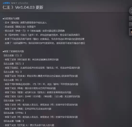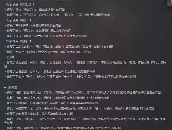 武器系统的修复是本次《仁王3》版本更新的重中之重,针对武士与忍者两大流派下多种武器的武技及操作异常进行了彻底排查与修正。