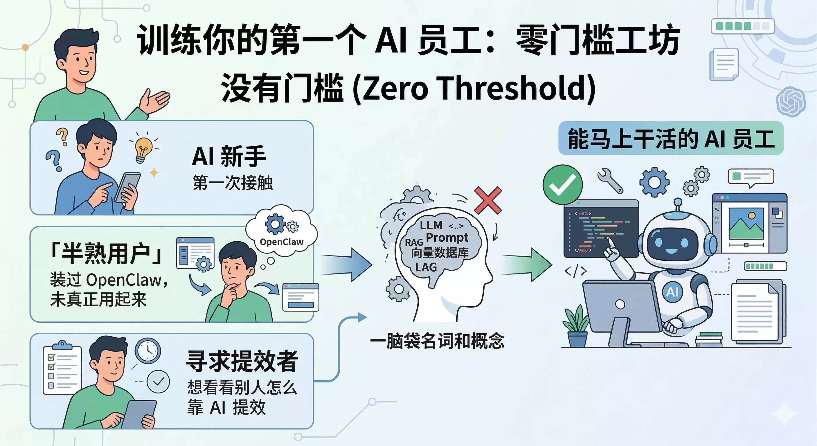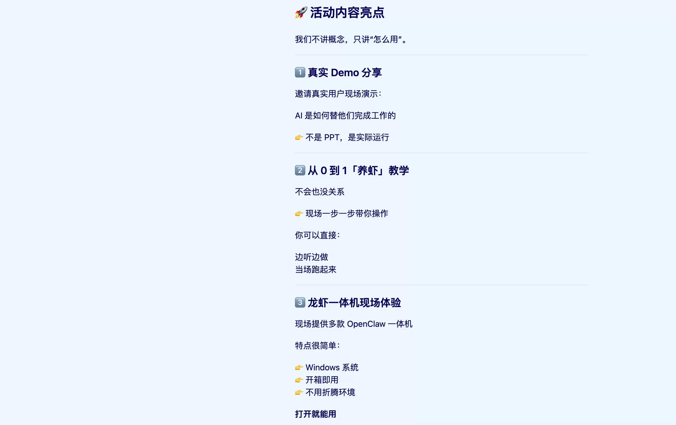活动页面的说明写得很直白:没有门槛。无论你是第一次接触AI的纯新手,还是已经安装过OpenClaw却始终没让它干活的“半熟用户”,亦或是单纯想来看看别人是如何利用AI提升效率的旁观者,这里都适合你坐下来听一听、动动手。主办方希望参与者离开时,带走的是一个能立即投入使用的“AI员工”,而不是一脑袋抽象的概念和晦涩的名词。