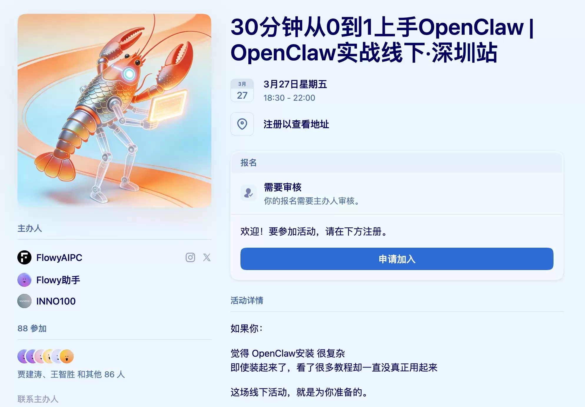3 月 27 日,深圳南山区,FlowyAIPC 联合 INNO100 举办的 OpenClaw 实战线下·深圳站即将开幕。活动的口号很直接——30 分钟,从 0 到 1,真正养一只龙虾。