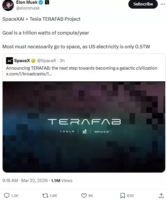 马斯克正式发布Terafab项目:目标年产1太瓦算力 主要于太空部署