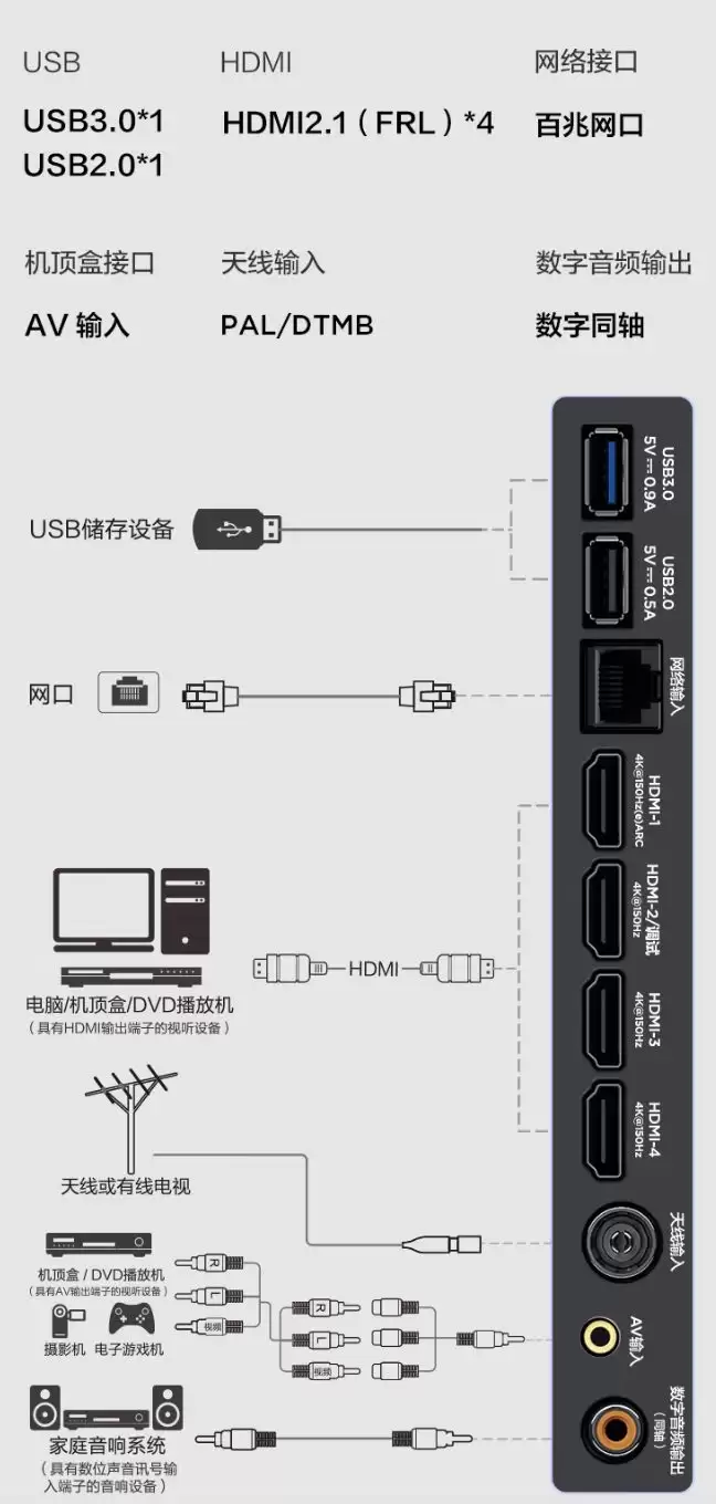 性能核心也没落下。系列电视搭载了联发科MT9655+芯片,搭配4GB的运行内存和128GB的机身存储,为系统的流畅运行和App安装留出了充足空间。网络连接支持最新的Wi-Fi 6标准,接口方面则提供了4个HDMI 2.1 FRL接口,对于同时拥有游戏主机、蓝光播放器和回音壁的用户来说,这样的配置无疑非常友好。