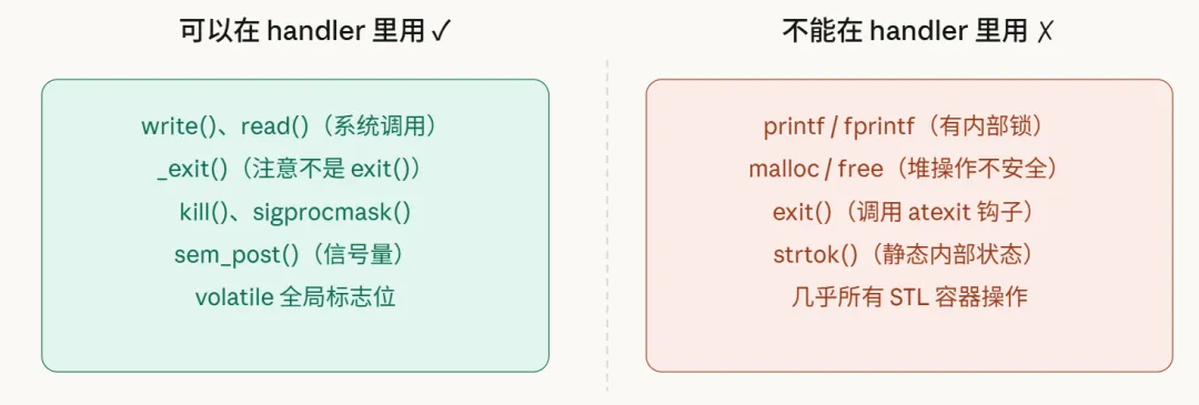 这是面试官最爱问,也是新手开发最容易栽跟头的地方。问题来了:信号可以在任何时间点打断程序,比如,当主线程的printf函数刚执行到一半,正在操作内部缓冲区时,信号来了。此时,如果信号处理函数里又调用了printf,会发生什么?
