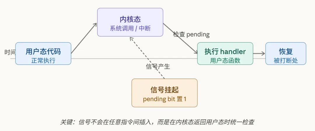 其实不然。信号真正的递送时刻,是在进程“从内核态返回用户态”的临界点。