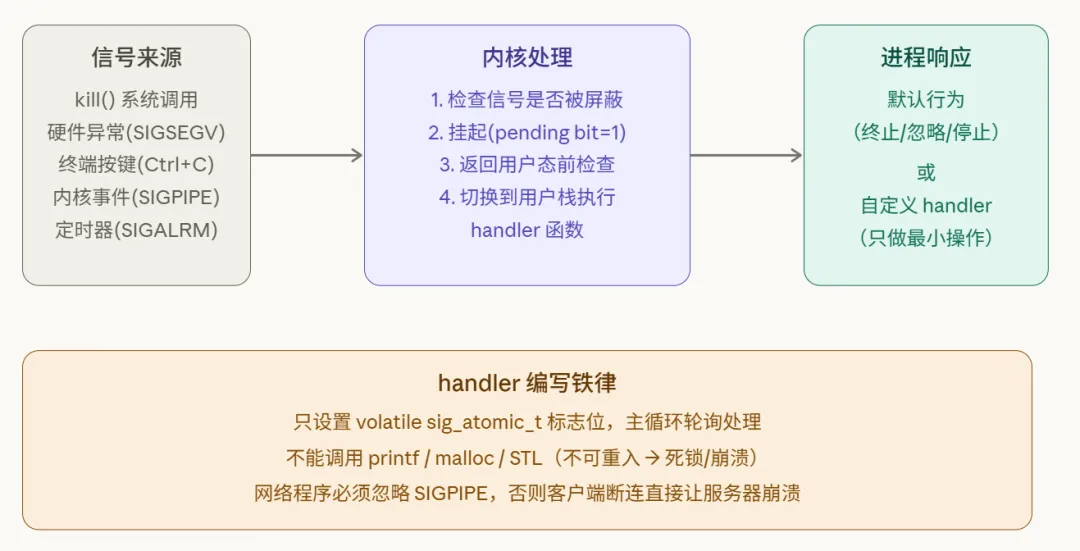 信号的生命周期,从产生、挂起到递送、处理,可以用一张图清晰地概括。理解这张图,信号机制的全局就尽在掌握了。