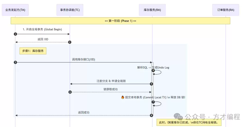 话说回来,Seata的AT模式本质上是对传统2PC协议的一个改良。改良的关键点就在于分支事务提交的时机。在经典2PC里,所有分支事务都得等着,处理完了再一块儿提交本地事务,数据库锁持有时间很长,性能自然受影响。而AT模式做了个优化:分支事务一经处理完成,就立即提交本地事务,把锁释放掉,以此换取更高的并发能力。