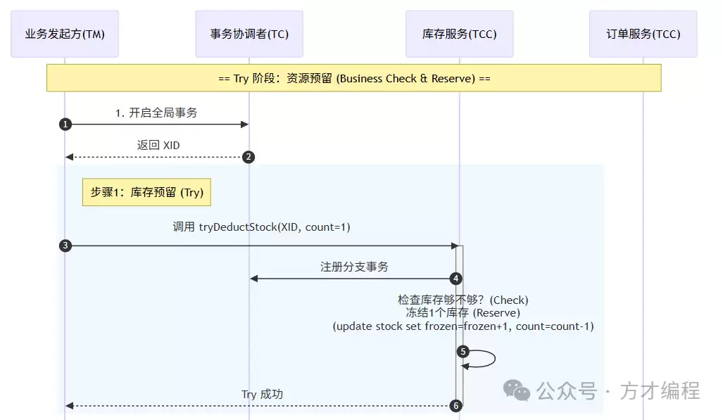 我们以Try阶段为例,参照上图。在库存服务执行完`tryDeductStock`(步骤6)之后,基于数据库原生事务,这个操作会直接提交。此时,如果有其他线程来读取商品库存,看到的状态会是:【总库存-1 且 冻结库存数+1】。