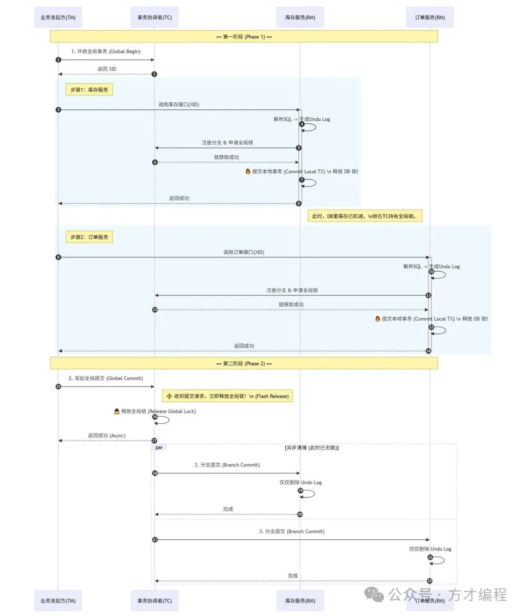这里有个细节值得注意:库存服务和订单服务的全局锁,其释放时机在正常提交和异常回滚两种情况下是不同的,而且释放速度有本质区别。这正是AT模式在多数成功场景下,性能表现出众的秘诀。