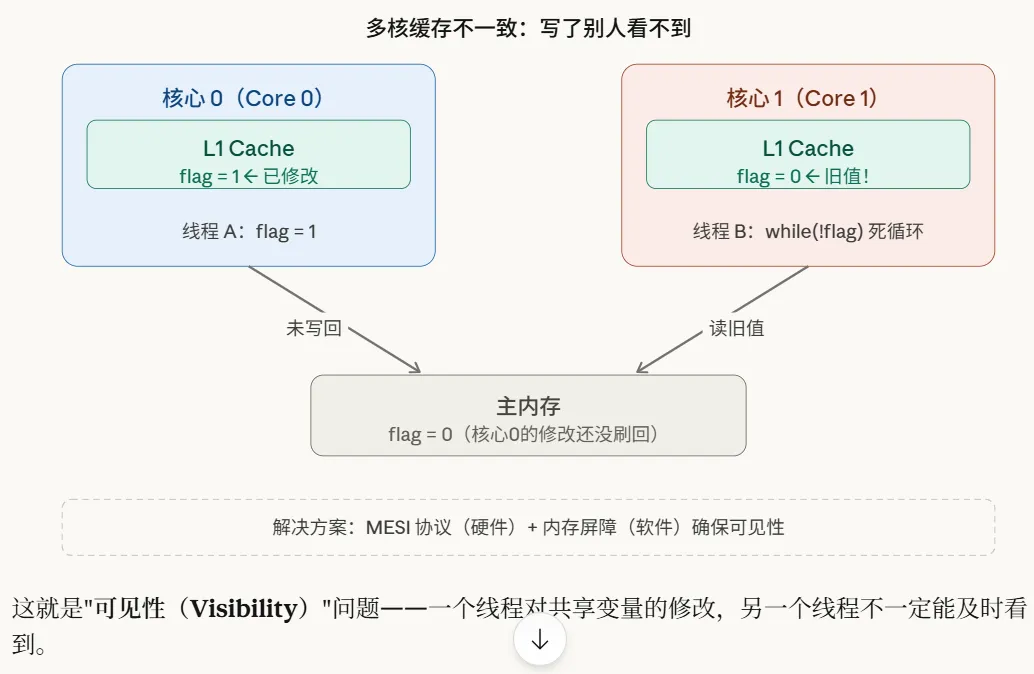 这就是典型的“可见性”问题——一个线程对共享变量的修改,另一个线程不一定能立刻,甚至不一定能看到。