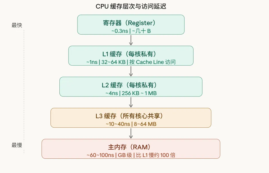 从L1缓存到主内存,延迟差距能达到惊人的100倍左右。这也就解释了,为什么写出“缓存友好”的代码,性能提升动辄就是数倍甚至数十倍。