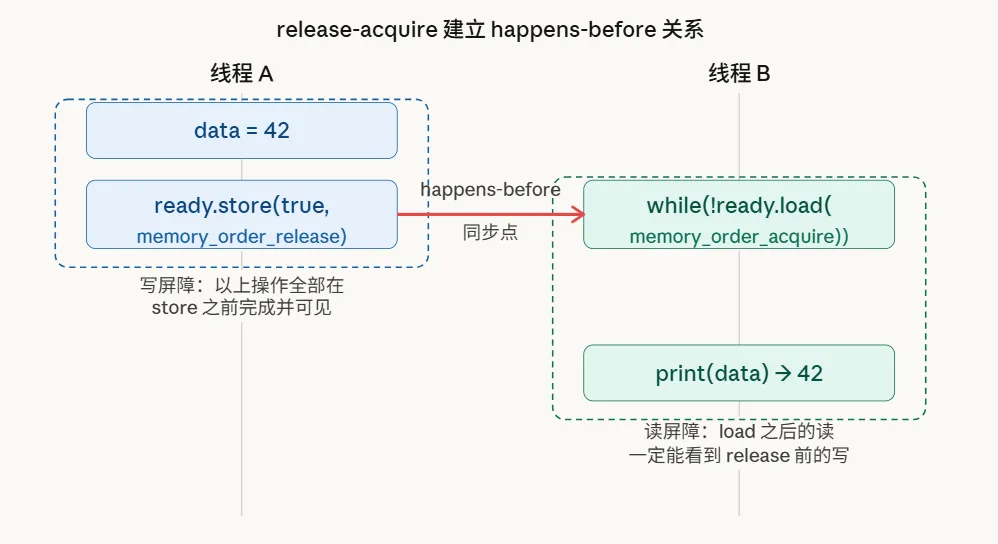 while (!ready.load(std::memory_order_acquire)); // 读屏障:保证看到 ready=true 后,也一定能看到 data=42