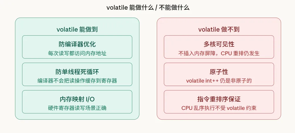 必须澄清一点:volatile的本意是告诉编译器:“这个变量可能会被外部因素(比如硬件)意外改变,别对它做优化,每次读写都老老实实去内存操作。”它的正确使用场景非常明确:内存映射的I/O寄存器、setjmp/longjmp场景,或者防止编译器把空循环优化掉。