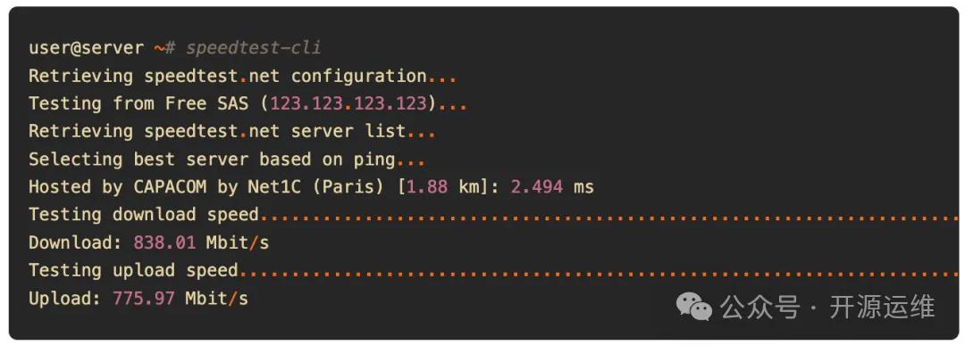 当需要给老板或同事一个快速答复时,speedtest-cli 无疑是最佳选择。安装后直接运行,稍等片刻,来自公共测速节点的下载、上传速度及延迟数据便一目了然。如果想看到更简洁的输出,加上 --simple 参数,结果就只剩下干净利落的三行数字。