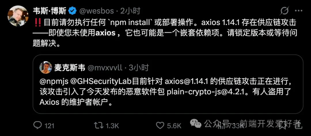事情是这样的:axios,这个npm上基石级别的依赖包,每周下载量轻松过亿,居然在两个最新发布的版本里被动了手脚。