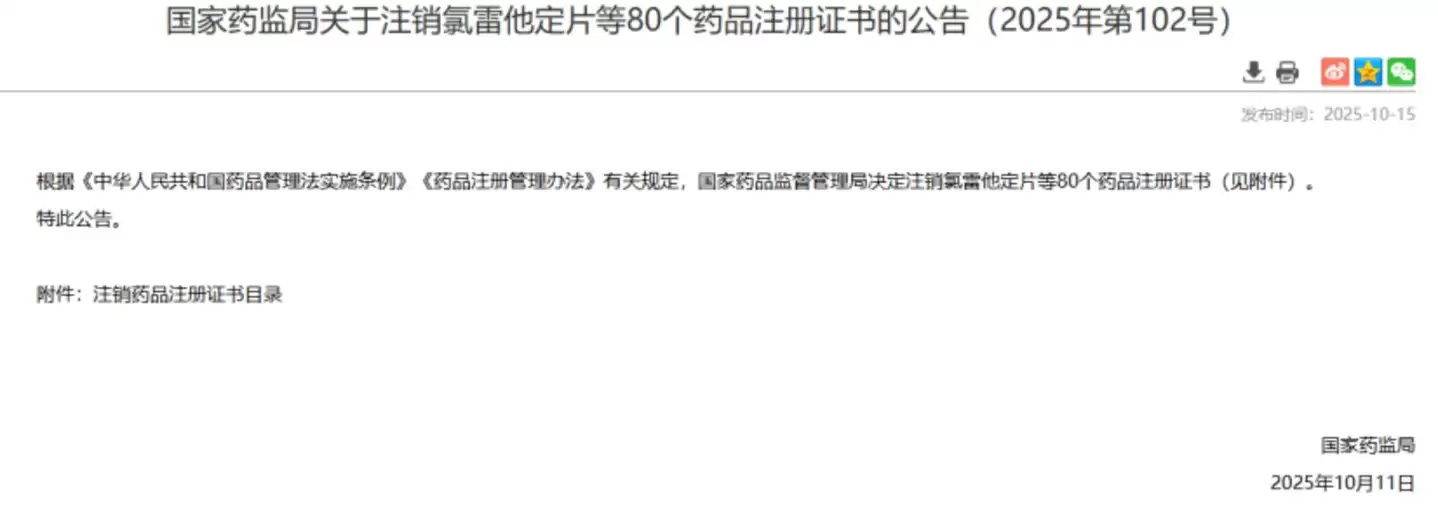 2025年7月,国家药监局宣布注销56个药品注册证书,其中外资企业产品超过30个。同年10月,药监局再次发布公告,正式注销包括氯雷他定片在内的80个药品注册证书,其中41款为进口药,涉及辉瑞、诺华、默克、拜耳、勃林格殷格翰等多家跨国制药巨头。