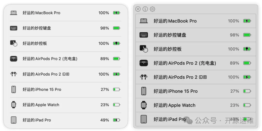 显示方式非常灵活,可以完全按照你的使用习惯来定制。偏爱简洁的用户可以选择只在菜单栏显示一个聚合图标;需要随时监控的就让它常驻Dock;习惯使用通知中心的,则可以通过小组件形式查看。值得一提的是,它的菜单栏图标还能动态变化,直观地以电池图形展示剩余电量,跟macOS系统原生风格保持了高度一致。