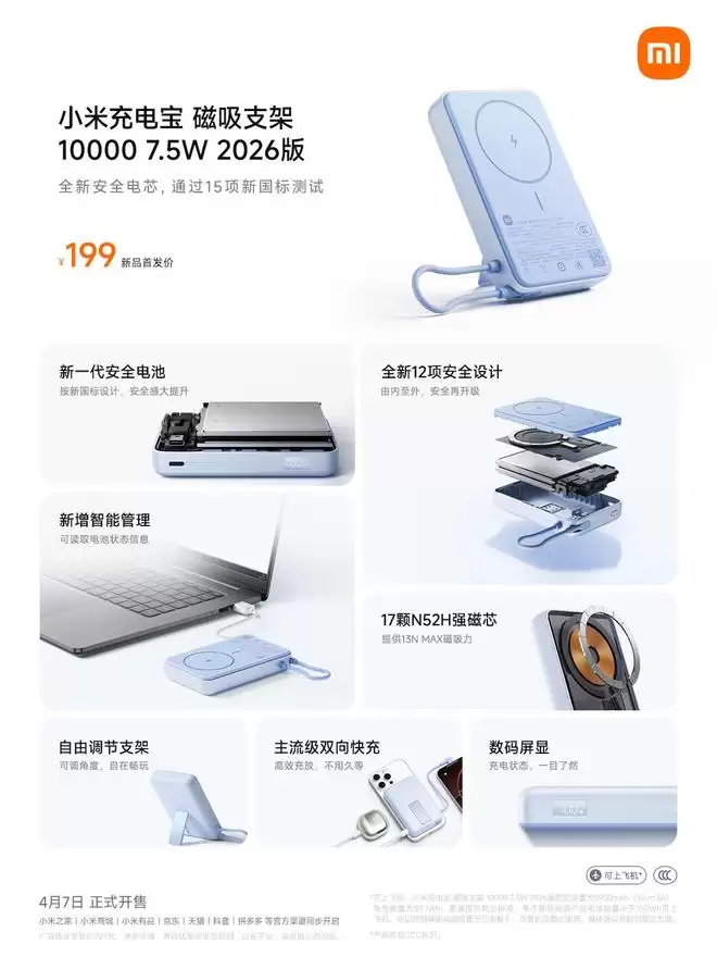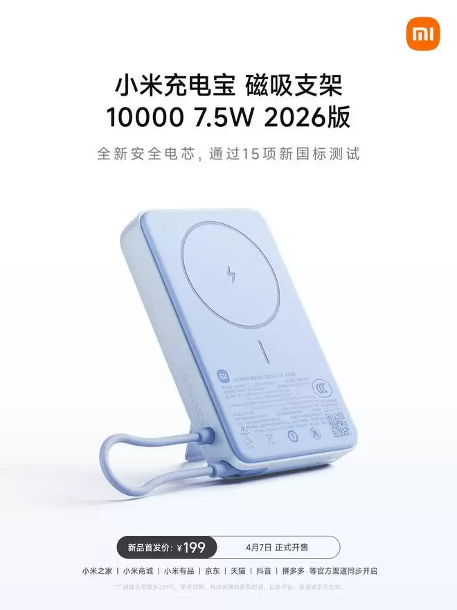 4月8日,小米正式推出了旗下首款满足最新《移动电源安全技术规范》强制性国家标准的充电宝产品。这款名为“小米充电宝磁吸支架 10000 7.5W 2026版”的新品已全面开售,官方首发价为199元。