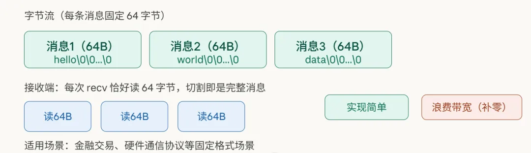 优点显而易见:实现极其简单。缺点也同样明显:当消息长度变化很大时,会造成带宽浪费,灵活性不足。这种方案通常用在消息格式确实固定的场景,比如某些硬件串口协议或标准的金融交易报文。