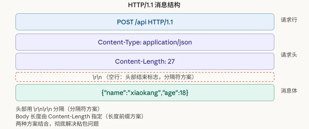 HTTP/1.1协议堪称一个优雅的综合案例,它巧妙结合了分隔符和长度前缀两种方案: