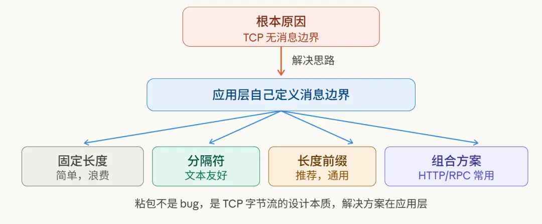 第二,知道“怎么办”:应用层需要自行定义消息边界。无非四种主流方案——固定长度、特殊分隔符、长度前缀、或像HTTP那样的组合方案,根据实际场景四选一即可。