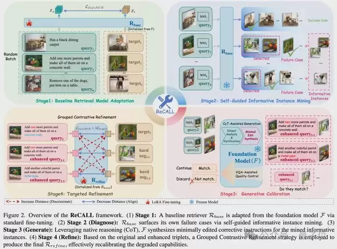 研究团队给出的答案是ReCALL框架,其核心思想颇为巧妙:利用大模型原生的推理能力,去纠正检索空间中的认知盲区。整个流程被严谨地设计为四个阶段。第一阶段完成了检索器的初始化,同时也暴露了退化问题;后续三个阶段,则构成了一套精密的“诊断-生成-打磨”校准管线: