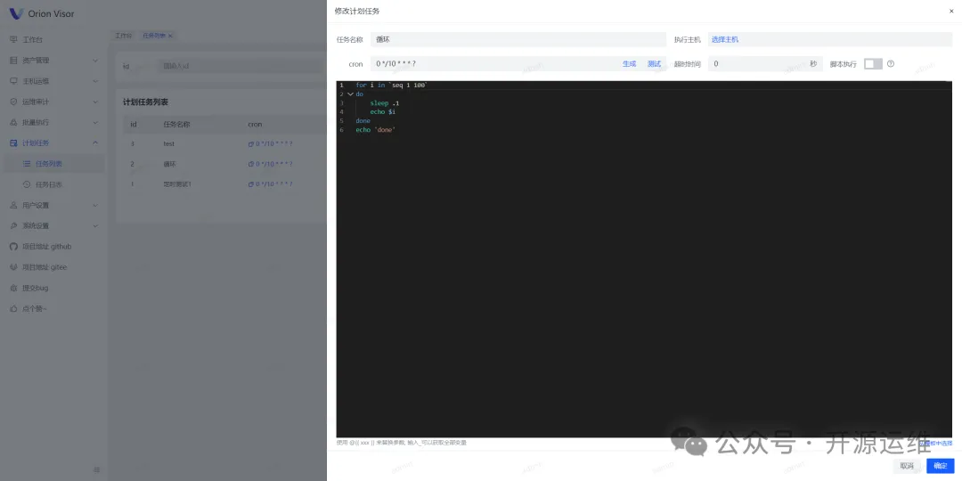 计划任务: 支持配置cron表达式,实现定时自动执行主机命令。将那些规律的、重复的运维工作交给系统自动完成,解放人力。